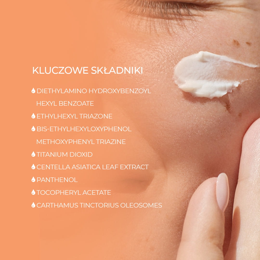 Aqua, C12-15 Alkyl Benzoate, Acrylates Copolymer, Diethylamino Hydroxybenzoyl Hexyl Benzoate, Propanediol, Ethylhexyl Triazone, Bis-Ethylhexyloxyphenol Methoxyphenyl Triazine, Triethanolamine, Phenoxyethanol, Parfum, Tocopheryl Acetate, Panthenol, Centella Asiatica Leaf Extract, Carthamus Tinctorius Oleosomes, Glycerin, Glycerin Glucoside, Caprylyl Glycol, Benzoic Acid, Ethylhexylglycerin, Cyclopentasiloxane, Dimethicone, Sodium Hydroxide.
