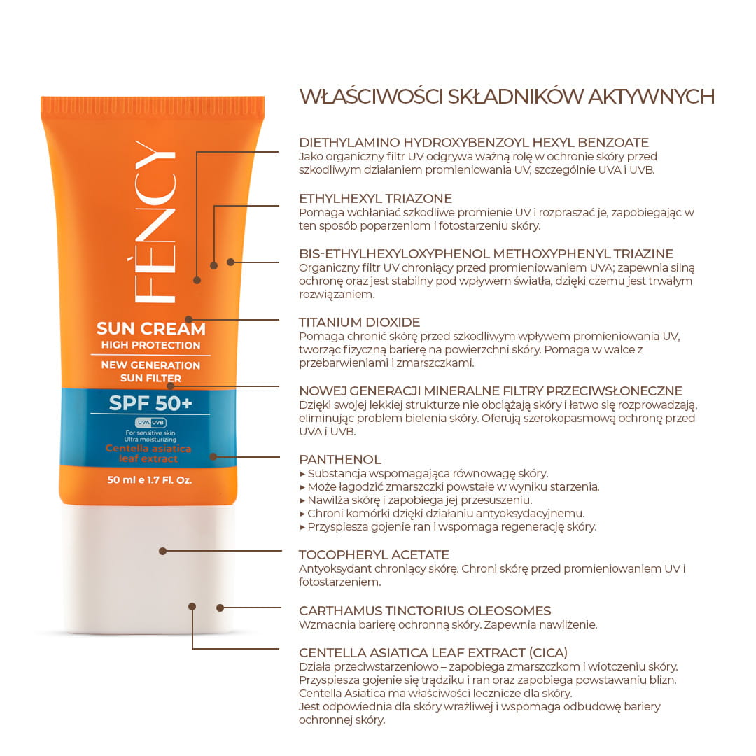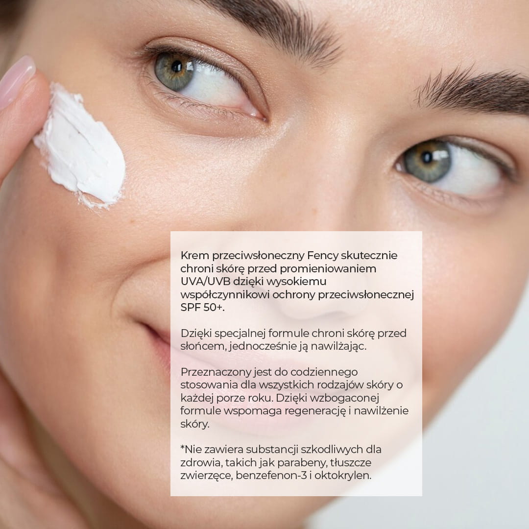 Fency krem przeciwsłoneczny 50+ SPF, dzięki wysokiej ochronie, skutecznie chroni skórę przed promieniowaniem UVA/UVB. Dzięki nowoczesnej formule krem nie tylko chroni przed słońcem, ale też nawilżą i regeneruje skórę. Zawiera Phanthenol, ekstrakt z Centella Asiatica oraz witaminę E, które wspierają regenerację i pozostawiają skórę miękką i gładką. Idealny do codziennego stosowania przez cały rok, dla każdego typy skóry.