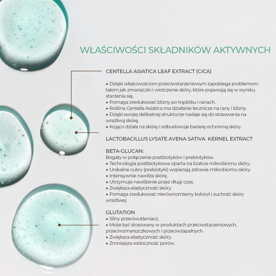 Dzięki obecności wąkroty azjatyckiej (Centella Asiatica Leaf Extract), pantenolu i allantoiny żel koi skórę i wspiera jej regenerację, a beta-glukan oraz ekstrakt z owsa wzmacniają barierę ochronną skóry.